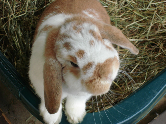 Charlie & April are going to be staying a little bit longer with us as their Bunny Mom has had some delays in getting home from her holiday. Both buns have been enjoying themselves and are very entertaining. Here they are outside in a run and we gave them a big washing basket full of hay to play in.